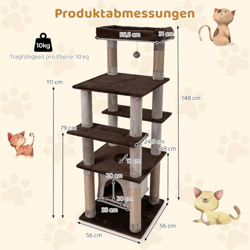 COSTWAY Kratzbaum, 148 cm, Katzenbaum mit schwingender Katzenhöhle, großer Basis, großem Liegebett, Kratzpfosten, Ball & Plattformen, Stabiler...