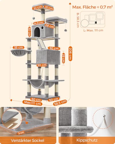- [Stabil, sicher und geschützt] Dank Qualitätsspanplatten, einer großen Basis mit verstärkten Bodenleisten sowie einem Kippschutz ist dieser stabile Kratzbaum für bis zu 6 große Katzen (jeweils 7 kg) geeignet